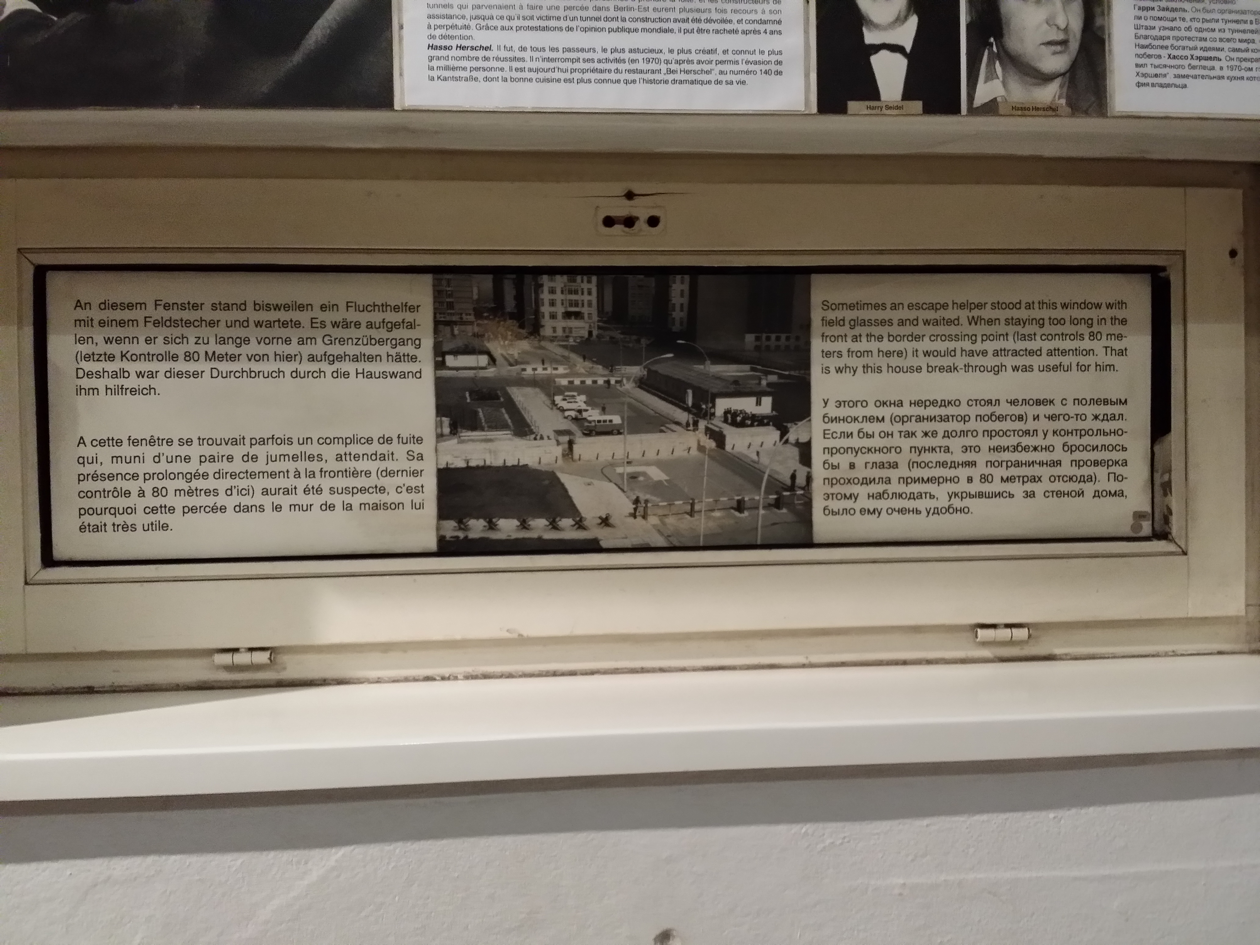 „Am 14. Juni 1963 wurde das „Haus am Checkpoint Charlie“ eröffnet und zu einer Insel der Freiheit im letzten Gebäude direkt vor der Grenze. Hier konnten Fluchthelfer durch ein kleines Fenster alle Bewegungen am Grenzübergang beobachten, hier waren Geflüchtete stets willkommen, hier wurden Fluchtpläne ausgedacht und immer gegen das Unrecht in der DDR gekämpft“ – so steht es in einer kleiner Infobroschüre des Museums geschrieben.