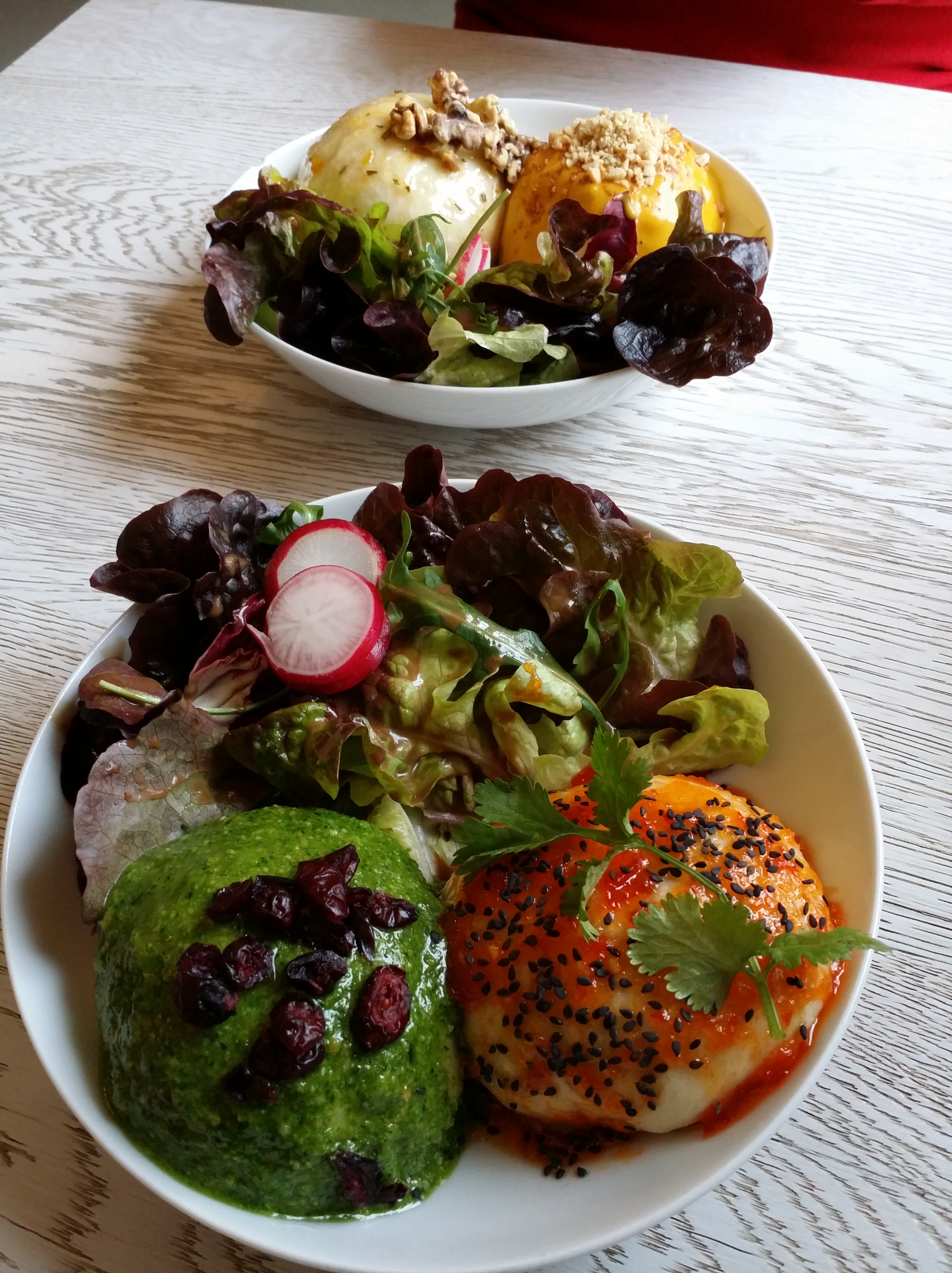 Wer in Berlin zu Besuch ist, dem empfehle ich auf’s Wärmste einen Besuch im Häppies in der Dunckerstr. Diesmal haben Bärbel und Matthias sowie eine kleine Netti den Weg auf meinen Teller gefunden. Unglaublich lecker – Matthias – der Scharfe mit Bio-Schweinefleisch und Bärbel mit Ziegenkäse, Honig und Rucolapesto. Und von Netti – dem weltbesten Germknödel ganz zu Schweigen. Ach ja, im oberen Bild sind Gabriel und Ben (eine vegane Variante mit Tofu) zu sehen.