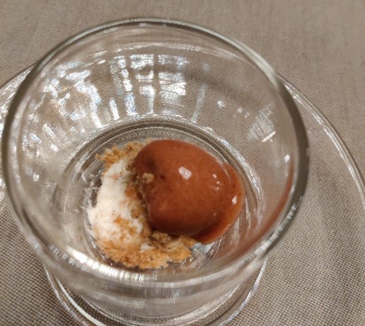 Der eigentliche 5. Gang war ein Eis von der gebackenen weißen Schokolade, Caramelia-Schokocreme und Apfelgel und Apfelrosen / Scheibchen und eine Zimtschnecke sowie Muskovado-Zucker Crumb