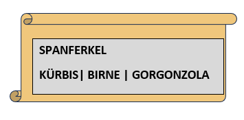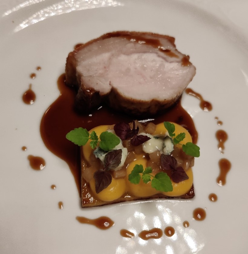 Eine Scheibe gegrillter Spanferkelrücken lag neben einer phantastischen Kombination aus gebratenem Butternut-Kürbis, Birnen-Chutney und Gorgonzola eingebettet auf eine phantastische Spanferkel-Jus. Allein die Kombination Kürbis, Birne und Gorgonzola ist super…und habe ich schon mal erwähnt, dass die Jus immer der Hammer sind 😉?!
