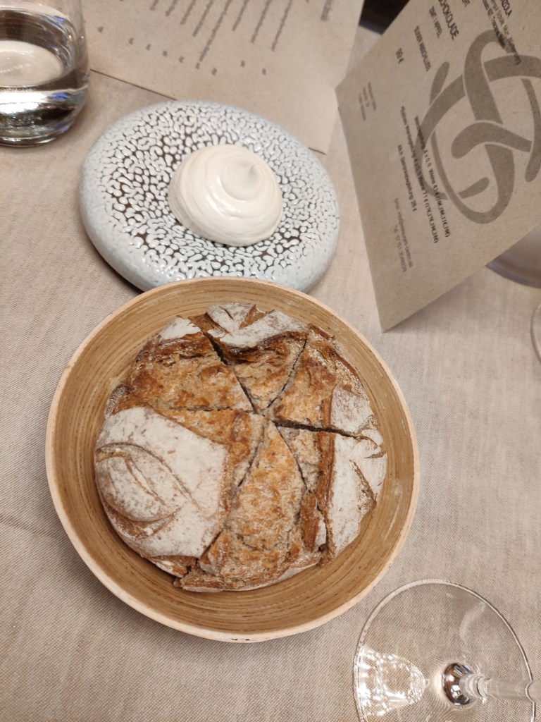 Zum Aperitif gab es diesmal einen spritzigen Crémant von der Loire – bevor das Amuse Bouche kam: ein Traum in Sellerie – ein Selleriesüppchen mit oben drauf etwas schwarzem Pfeffer und Mandeln … und dazu gab es frisch aufgeschlagene französische Salzbutter und warmes toll duftendes Sauerteigbrot! …ich könnte mich allein am frischen Brot und der Butter jedes Mal satt essen :-)!