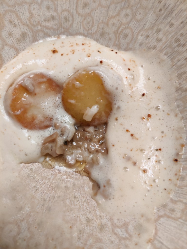 Hier kam einmal die Kartoffel obendrauf als Schaum bzw. Espuma und darunter waren versteckt zwei Bratkartoffeltaler und ein Kräutersaitling-Zwiebel Confit, sowie eingelegter grüner Pfeffer und für die restliche gab es oben noch etwas Harissa gestreut!