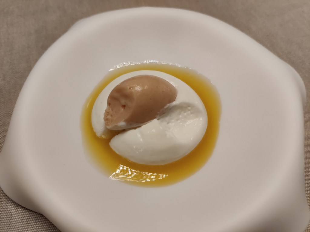 Das Pre-Dessert bestand aus einem Quittensorbet,Honig-Mascarpone-Espuma und Orangensud außen rum…vor lauter lecker, fast das Bild vergessen…
