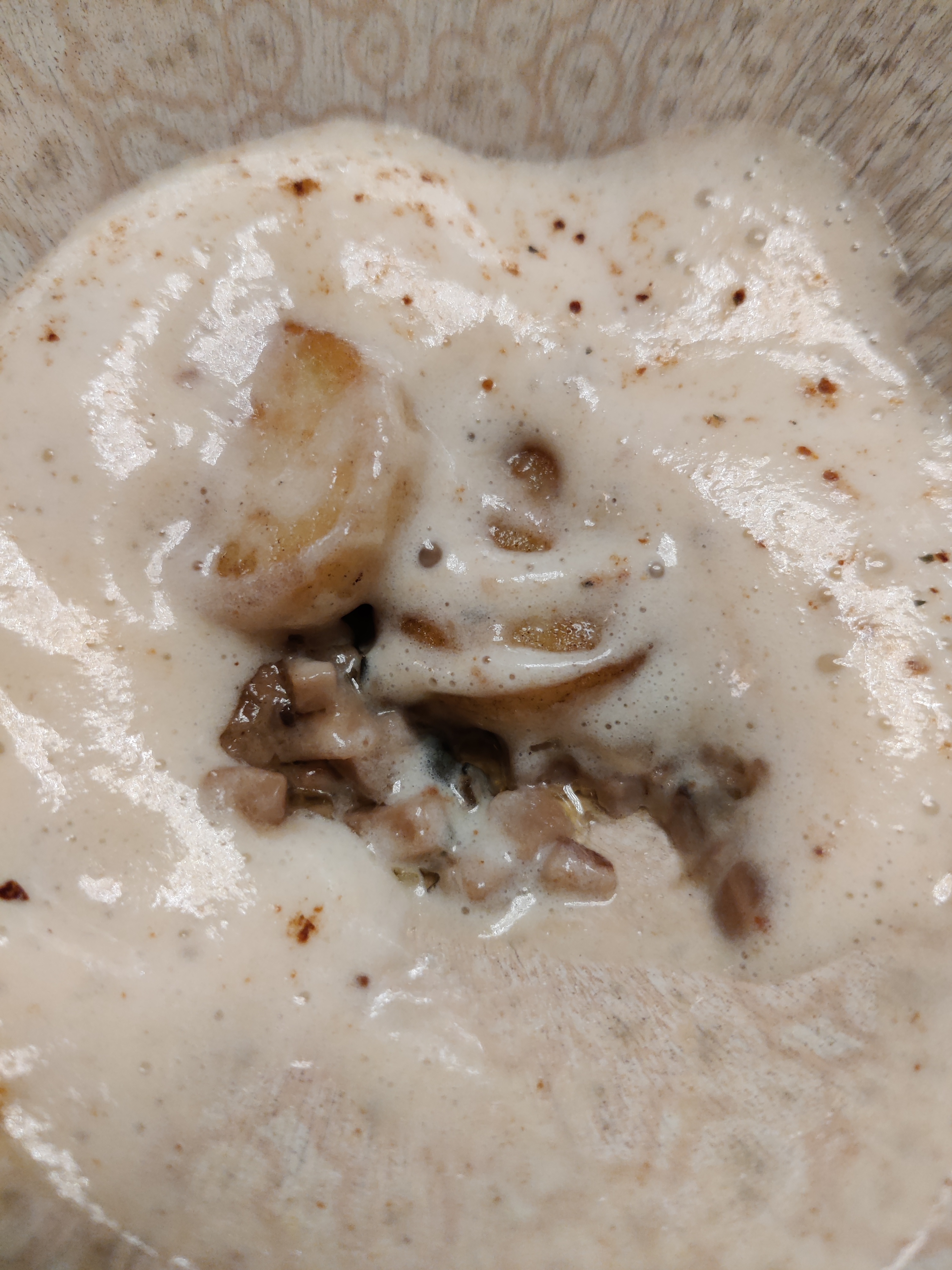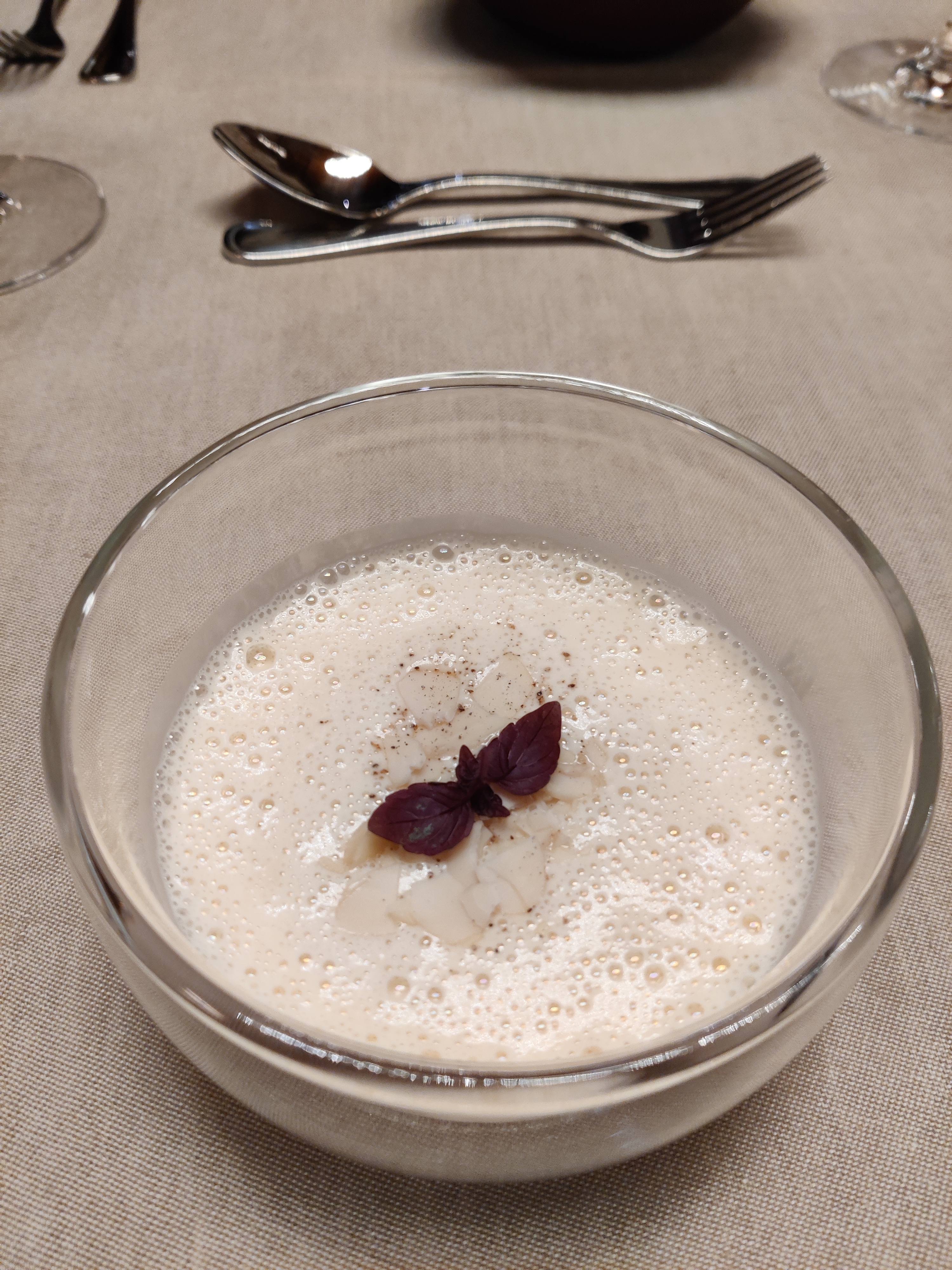 Zum Aperitif gab es diesmal einen spritzigen Crémant von der Loire – bevor das Amuse Bouche kam: ein Traum in Sellerie – ein Selleriesüppchen mit oben drauf etwas schwarzem Pfeffer und Mandeln … und dazu gab es frisch aufgeschlagene französische Salzbutter und warmes toll duftendes Sauerteigbrot! …ich könnte mich allein am frischen Brot und der Butter jedes Mal satt essen :-)!