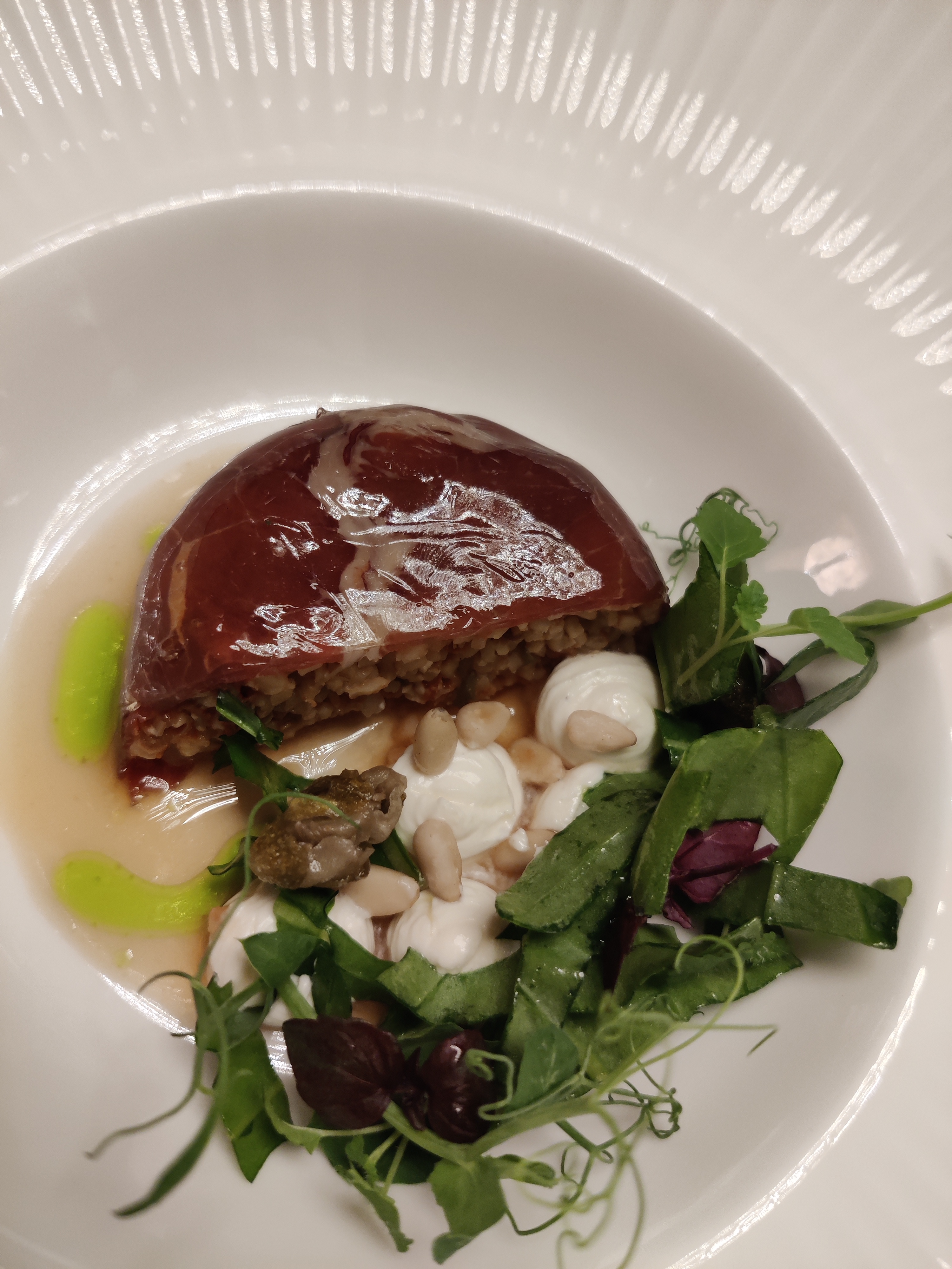 Bünderfleisch – das Wort verursacht bei mir meistens ein Grinsen, weil ich sofort an ein legendäres Video aus Österreich erinnert (hier der Link dazu – viel Spaß: https://www.youtube.com/watch?v=E5agWxzWTsc ) und die „Praline“ bzw. der Mantel aus Bündnerfleich, der gefüllt war mit Bulgur, getrockneten Tomaten, Kapern und Pinienkerne – daneben etwas Schmand und Rucola, Pinienkerne und frittierte Kapern und Kräutern. Und als Untergrund eine Rinder-Vinaigrette und Kräuteröl. Was für eine tolle Geschmackkomposition und die Weine brachten nochmal den extra Kick bei diesem Gang.