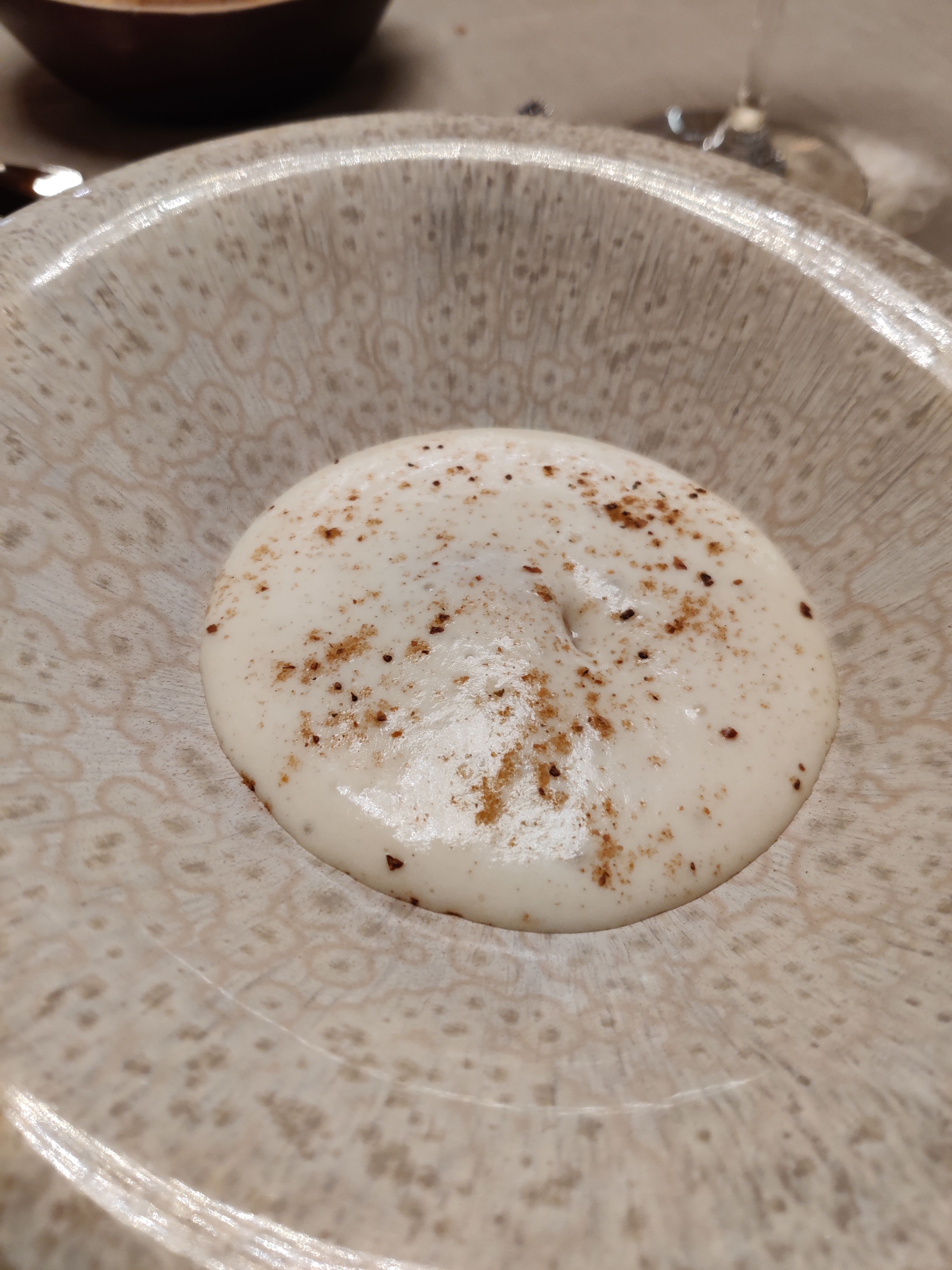 Hier kam einmal die Kartoffel obendrauf als Schaum bzw. Espuma und darunter waren versteckt zwei Bratkartoffeltaler und ein Kräutersaitling-Zwiebel Confit, sowie eingelegter grüner Pfeffer und für die restliche gab es oben noch etwas Harissa gestreut!