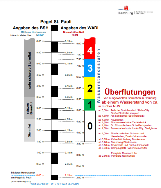 Da Wasserstände bis 5,00 m über NHN (entspricht 2,85 m über MHW) in Hamburg lediglich als deutlich erhöhtes Hochwasser wahrgenommen werden, benutzt Hamburg eigene Wasserstandsstufen: Wasserstandsstufe 0: ab 3,65 m bis 5,00 m ü. NHN Wasserstandsstufe 1: ab 5,00 m bis 5,50 m ü. NHN Wasserstandsstufe 2: ab 5,50 m bis 6,50 m ü. NHN Wasserstandsstufe 3: ab 6,50 m bis 7,30 m ü. NHN Wasserstandsstufe 4: ab 7,30 m über NHN