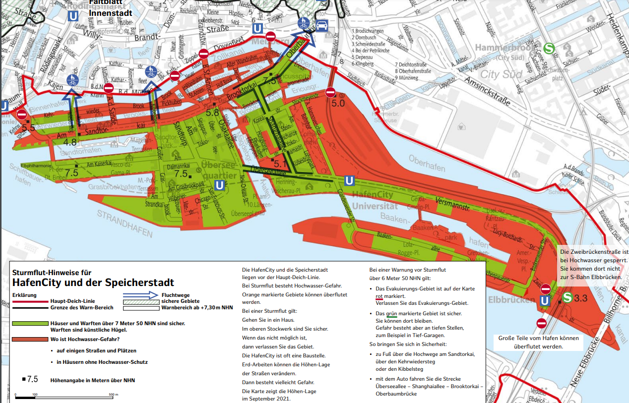 Für die einzelnen Überflutungsgebiete gibt es noch spezielle Flyer – hier ein kleiner Auszug aus der Hafencity, wo ich mich gerade befinde – im grünen Bereich ;-)!
